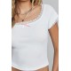 Kadın Beyaz Göğsü ve Kolları Dantelli Fiyonklu Kısa Kol Crop Top Bluz