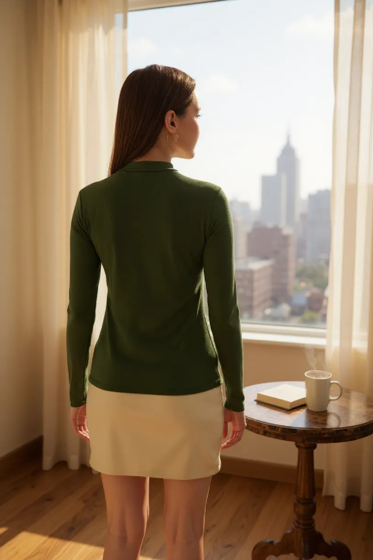 • Parmak detaylı uzun kollu body, haki yeşil rengin doğal ve modern havasıyla birleşerek casual ve şık kombinlere uyum sağlar.