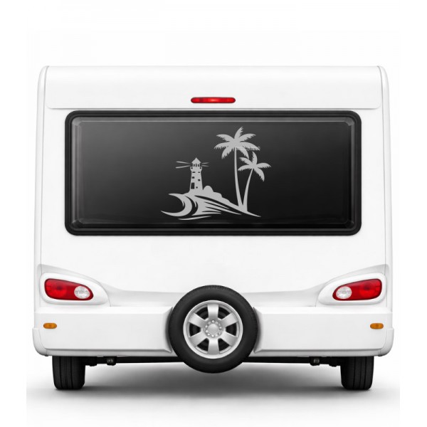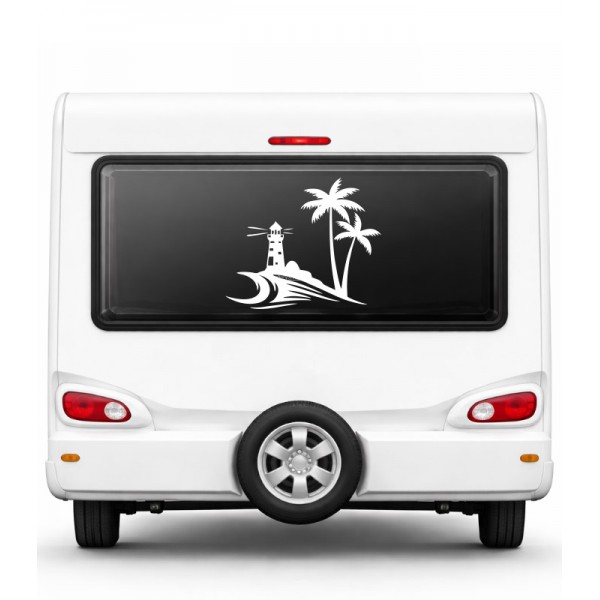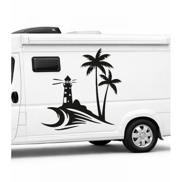 Deniz Feneri ve Palmiye Karavan Sticker – Dalga Temalı Camper Araç Sticker