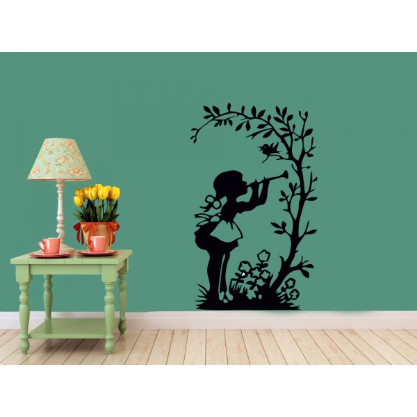 Flüt Çalan Kız ve Kuş Duvar Sticker