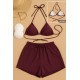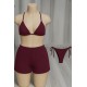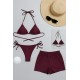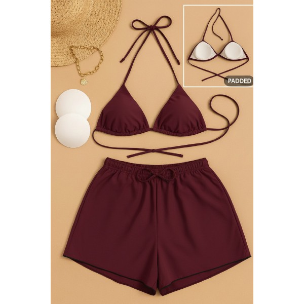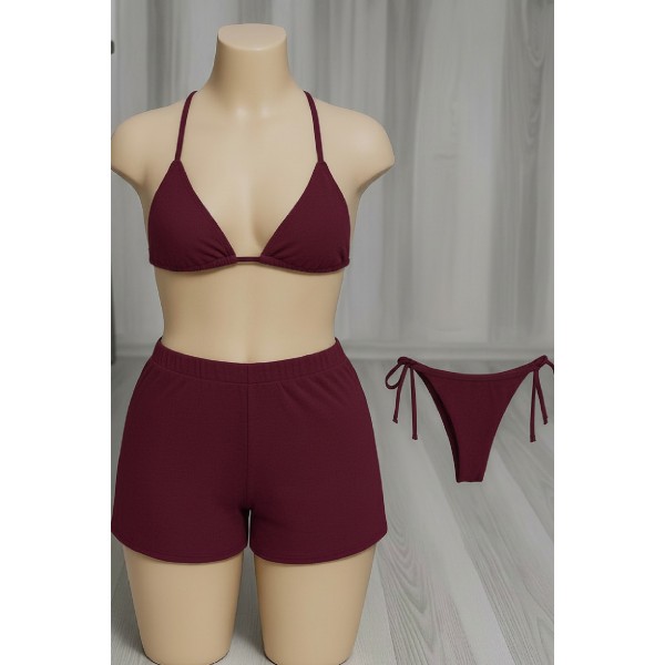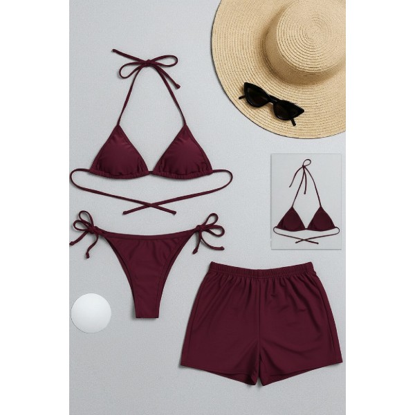 Kadın 3'lü Set Bordo Şortlu ve Yandan Bağlamalı Bikini Mayo Takımı