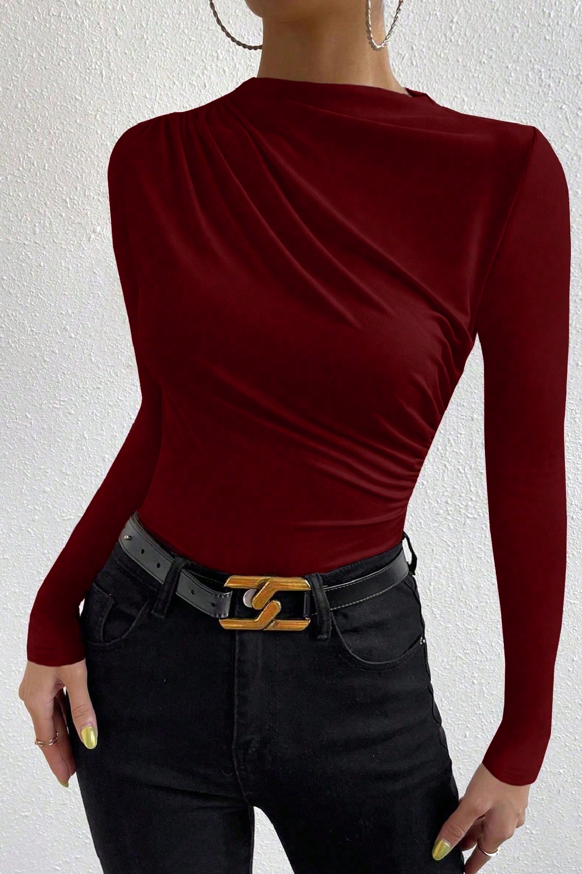 • Kadın Bordo Belden ve Boyundan Büzgü Detaylı Bluz, modern çizgileriyle her stile zarafet katacak özel bir tasarım.