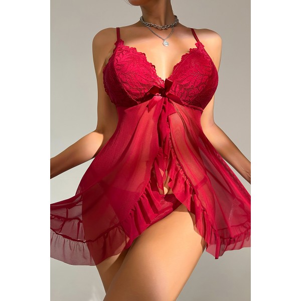 Kadın Bordo Dantelli, Fırfırlı Tül ve Fiyonk Detaylı Tangalı Gecelik Takımı