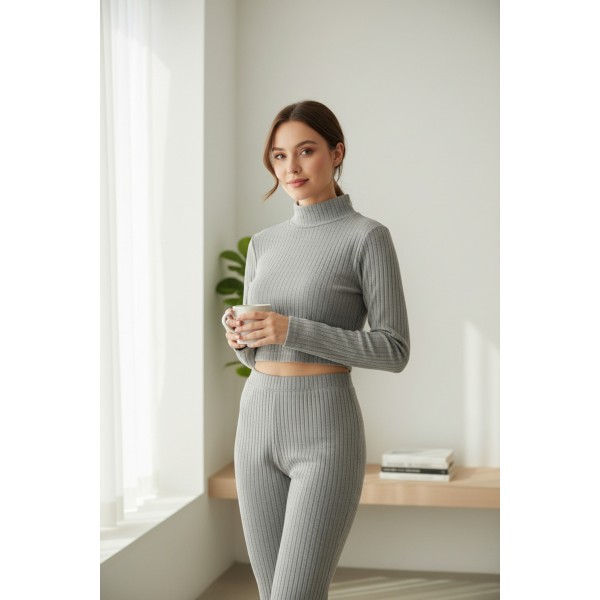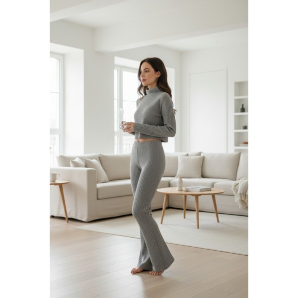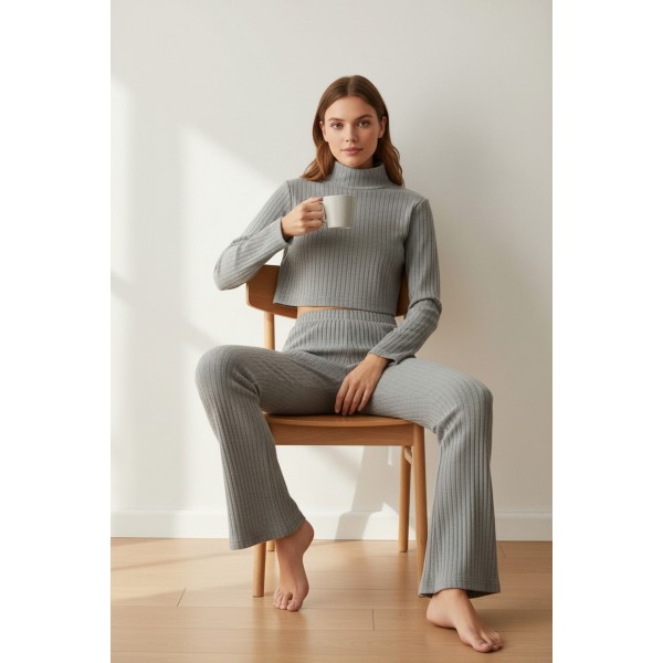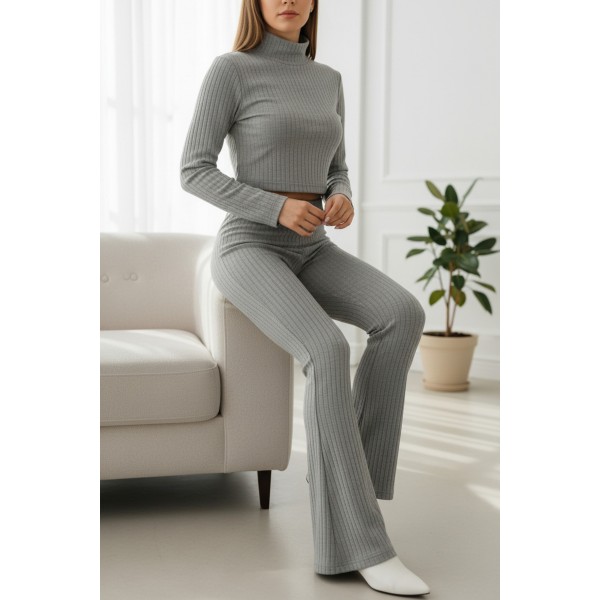 Kadın Fitilli Eşofman Takımı – Gri Boğazlı Crop Üst & İspanyol Paça Pantolon, Esnek Rahat Kalıp