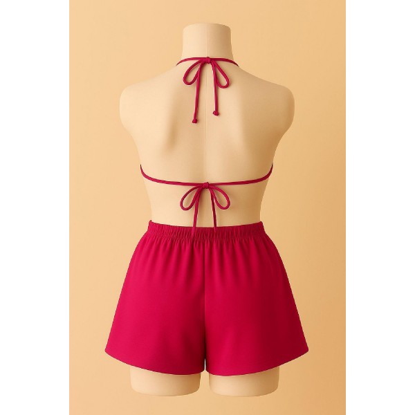 Kadın Fuşya Şortlu Belden ve Boyundan Bağlamalı Bikini Takımı