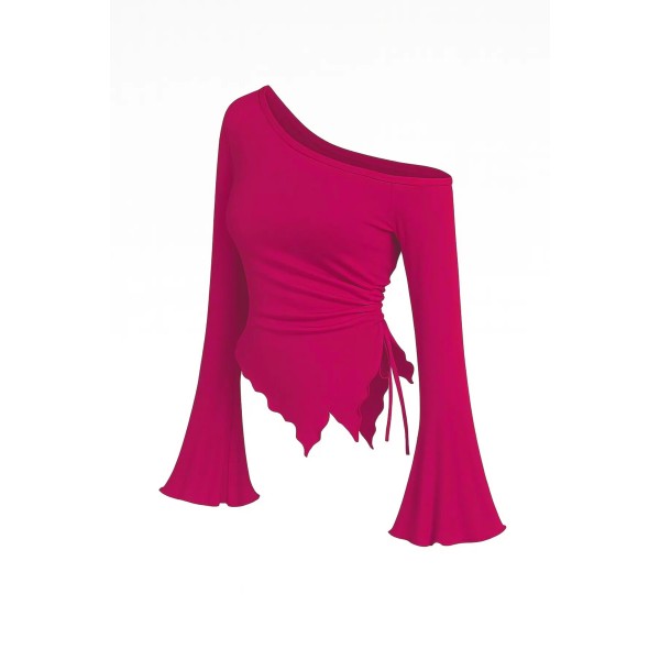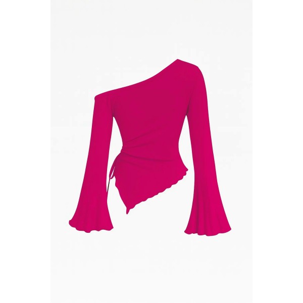 Kadın Fuşya Uzun İspanyol Kollu Asimetirik Yaka Yandan Bağlamalı Drapeli Bluz