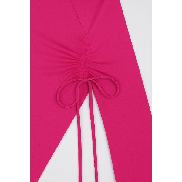 - İddialı ama zarif bir görünüm isteyenler için Kadın Fuşya Asimetrik Yaka Drapeli Yan Bağlamalı Bluz, gardırobun en enerjik parçalarından biri olacak.
