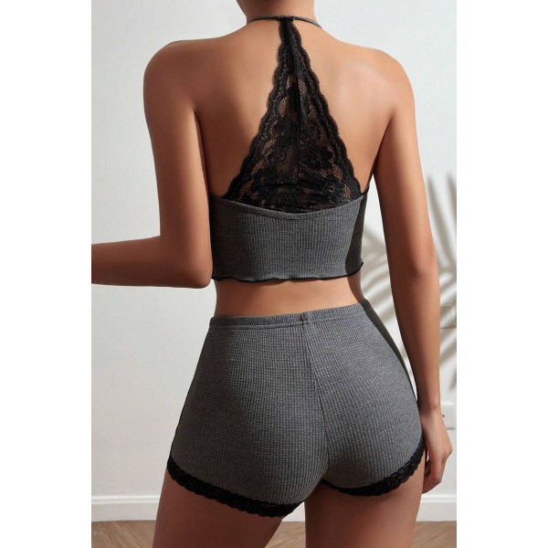 Kadın Gri Kaşkorse Sırt ve Bacak Kısmı Dantel Detaylı Şortlu Gecelik Takım
