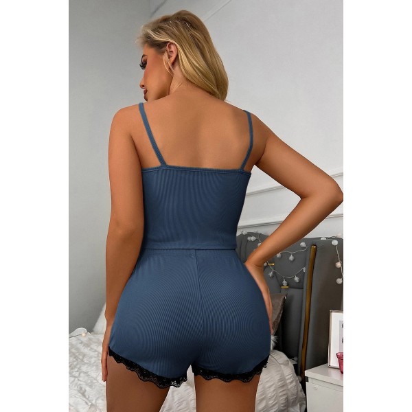 Kadın Lacivert Alt Ve Üst Dantel Detaylı Şortlu Gecelik Takımı