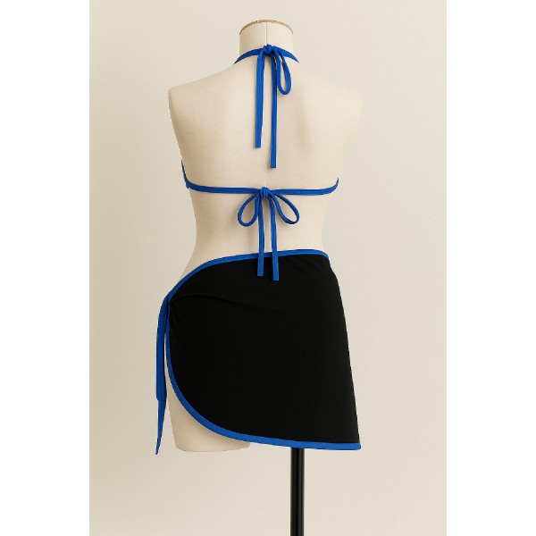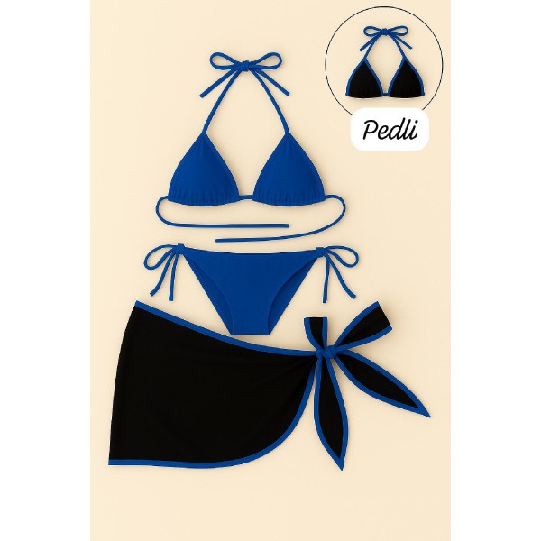- Mavi pareolu, yandan ve boyundan bağlamalı üçlü bikini takımı ile plajda şıklığınızı konuşturun.