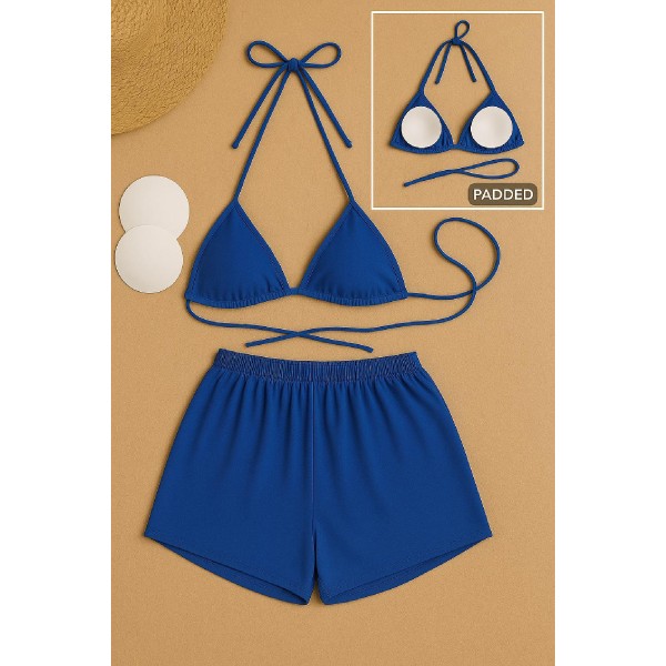 - Plaj şıklığınızı tamamlayacak, mavi renkli şortlu bikini takımı ile yaz günlerinin vazgeçilmezi olun.