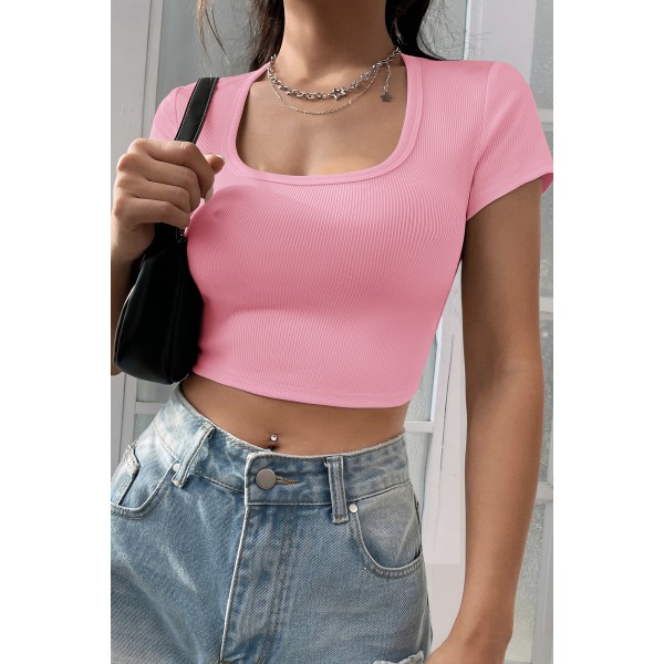 Kadın Pembe Yarım Kol Düz Yaka Crop Top Bluz