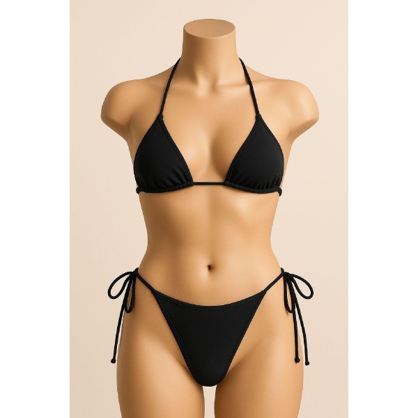 Kadın Siyah Yandan ve Boyundan Bağlamalı Bikini Mayo Takımı