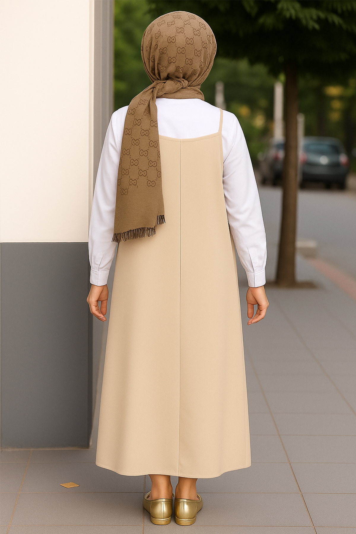 - Her kadının dolabında mutlaka bulunması gereken bu kadın taş rengi askılı jile elbise, hem şık hem de pratik kombinler için ideal bir seçim.