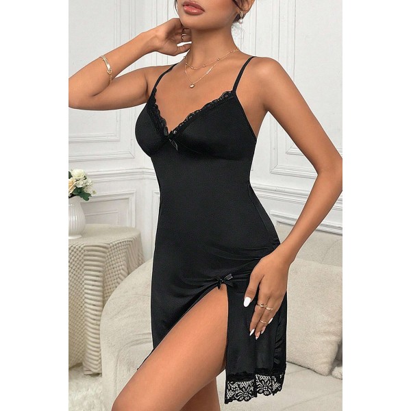 Kadın Siyah Dantelli Fiyonklu ve Yırtmaçlı Şık Gecelik