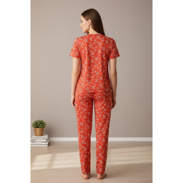 Kadın Turuncu Kalp Desenli Fiyonklu Kısa Kollu Uzun Pijama Takımı