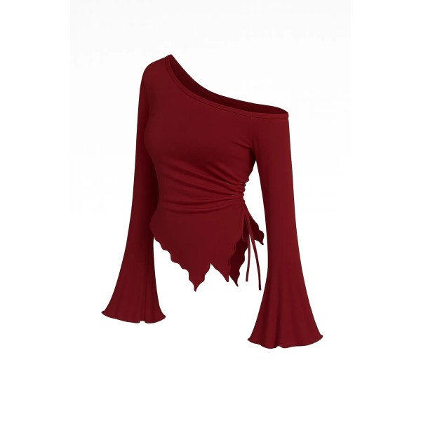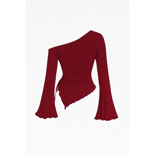Kadın Bordo Uzun İspanyol Kollu Asimetirik Yaka Yandan Bağlamalı Drapeli Bluz
