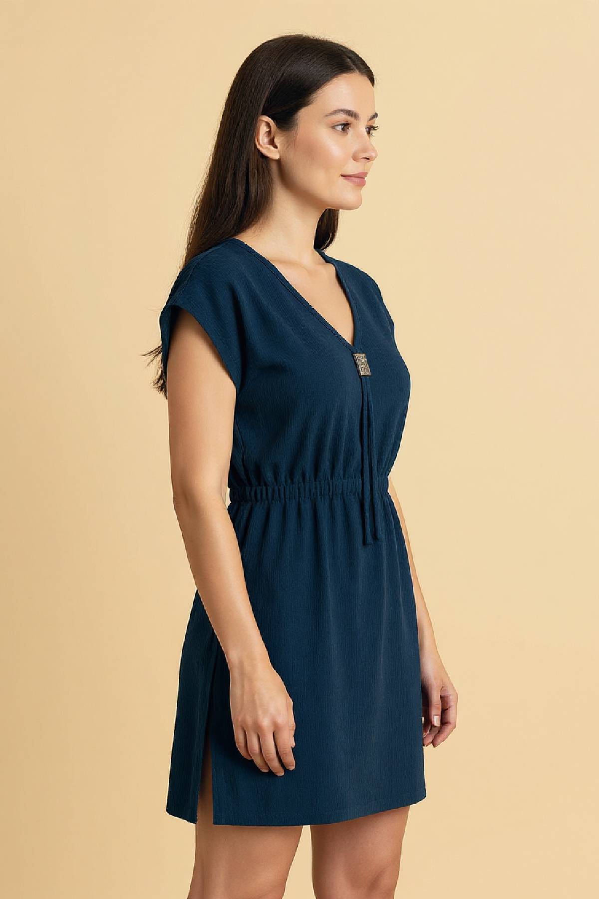 • Kadın Lacivert Yanları Yırtmaçlı Tokalı V Yaka Mini Plaj Elbisesi, yazın zarifliğini ve konforunu bir arada sunuyor.