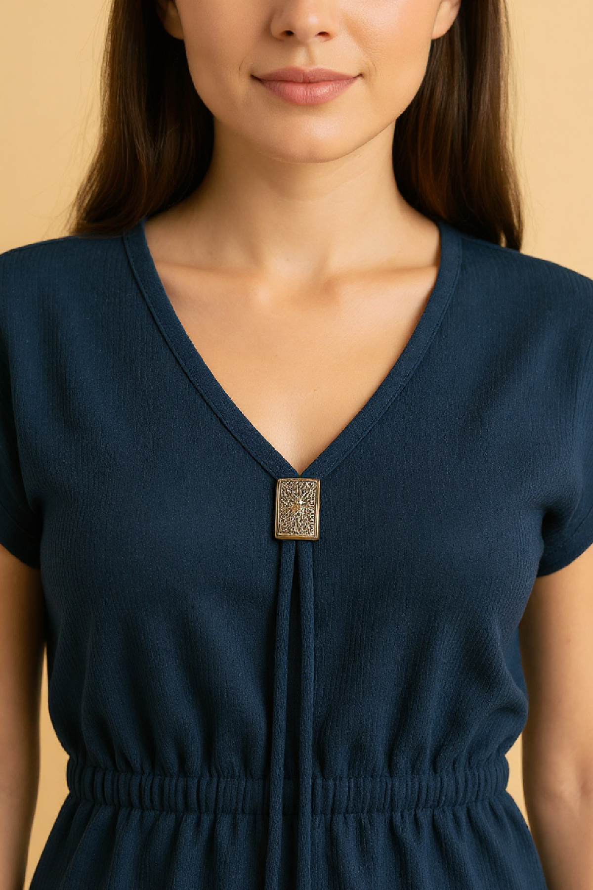 • Yumuşak dokulu hafif kumaşı sayesinde gün boyu rahatlık hissi verirken, modern V yaka kesimi ve bel kısmındaki zarif tokasıyla feminen bir siluet oluşturur.